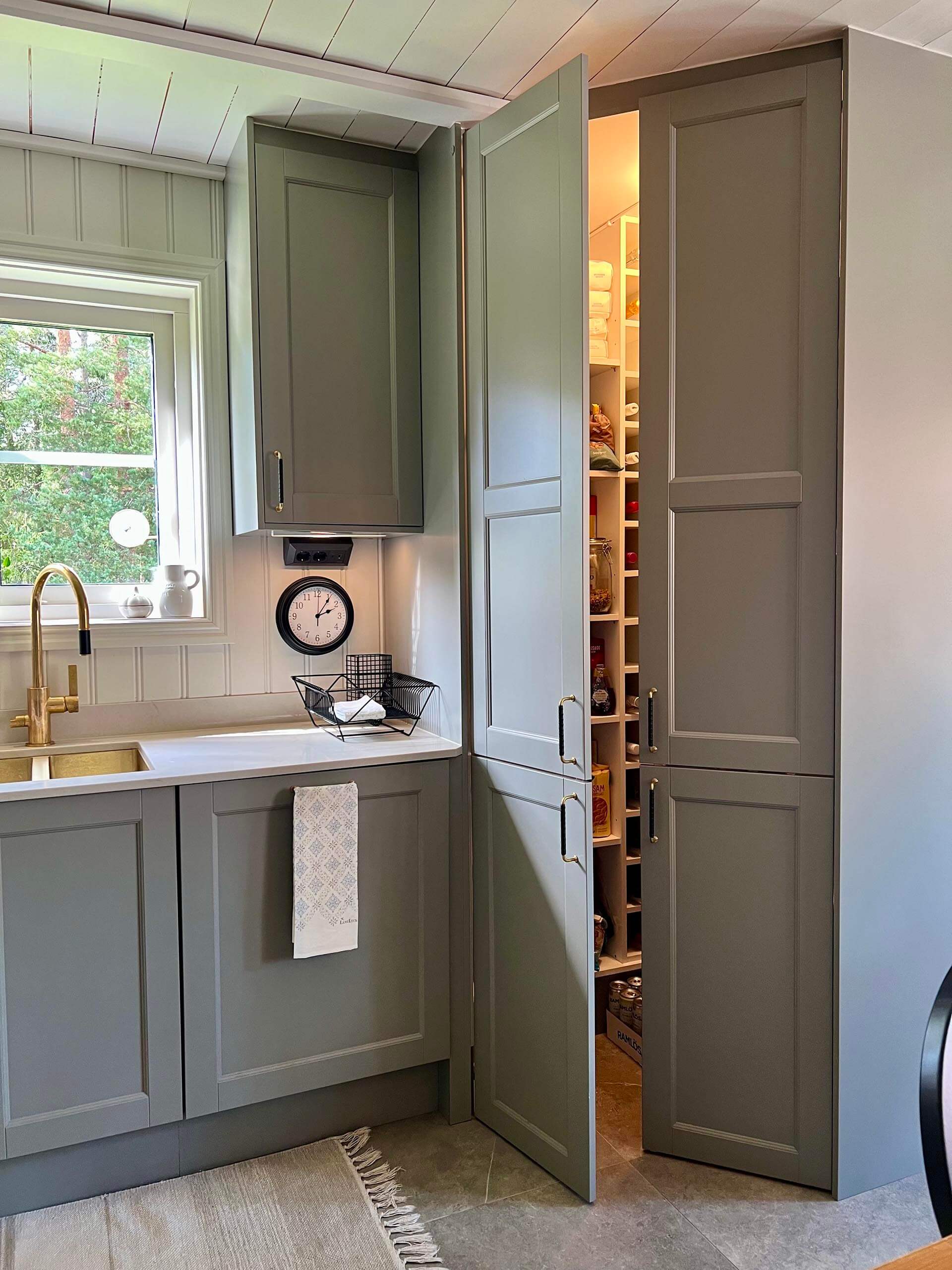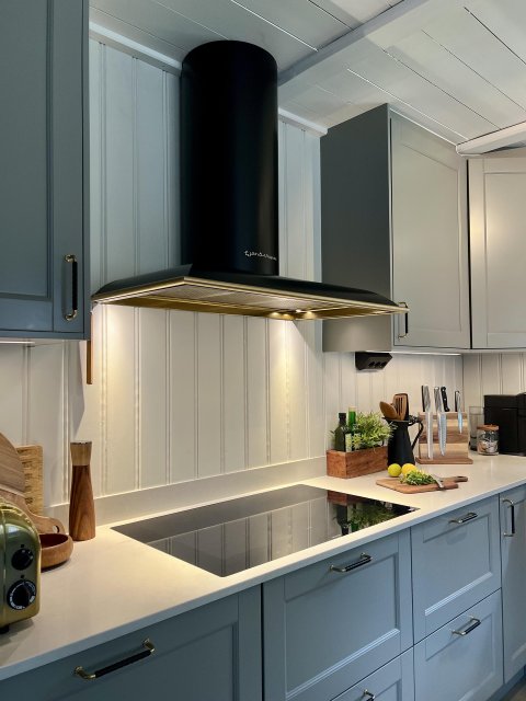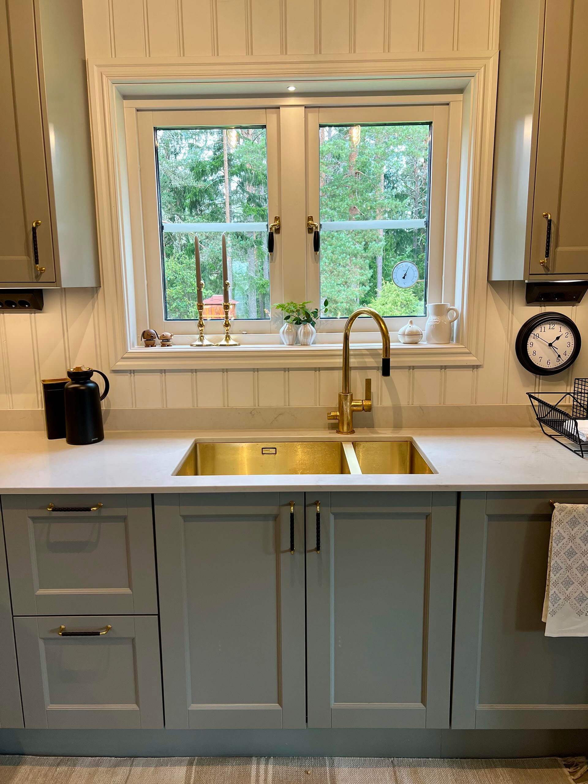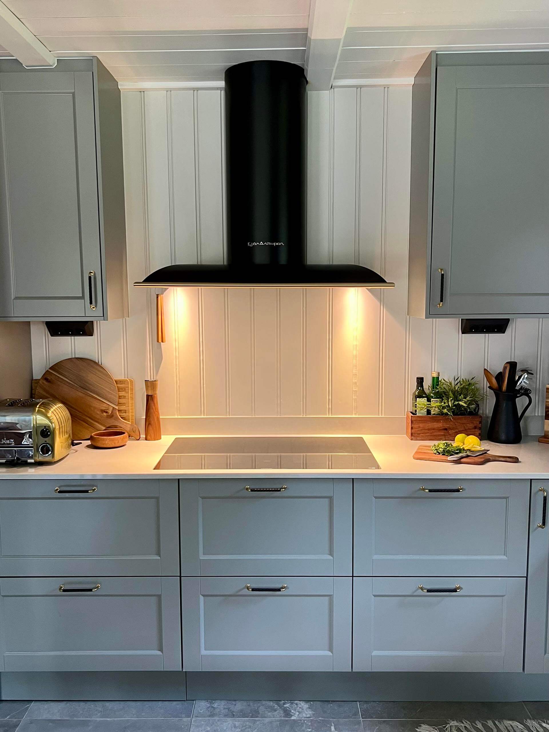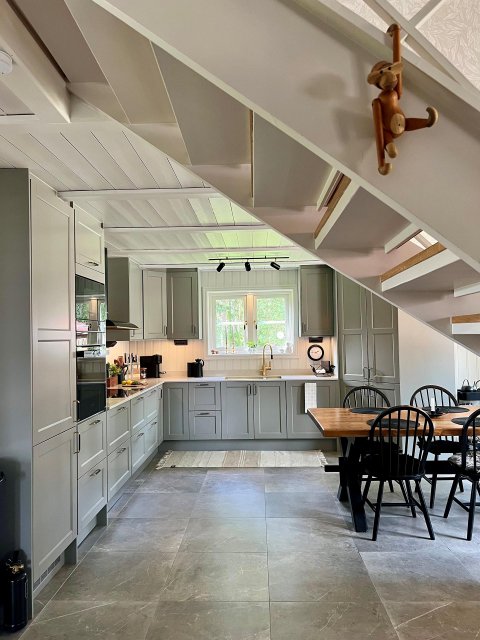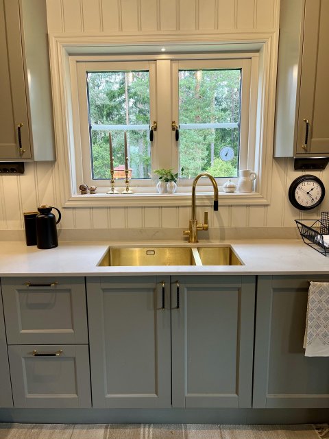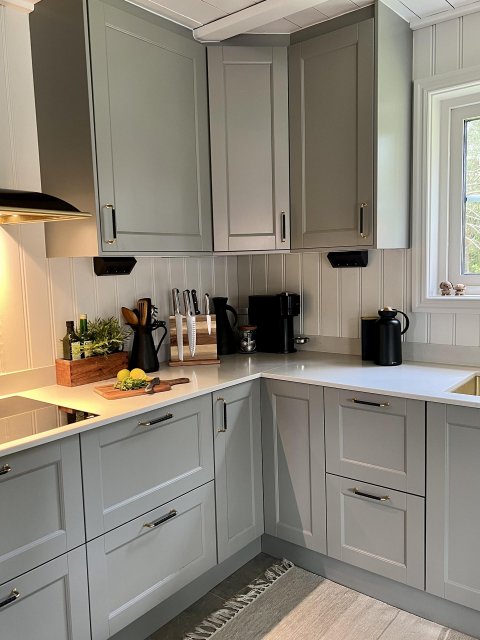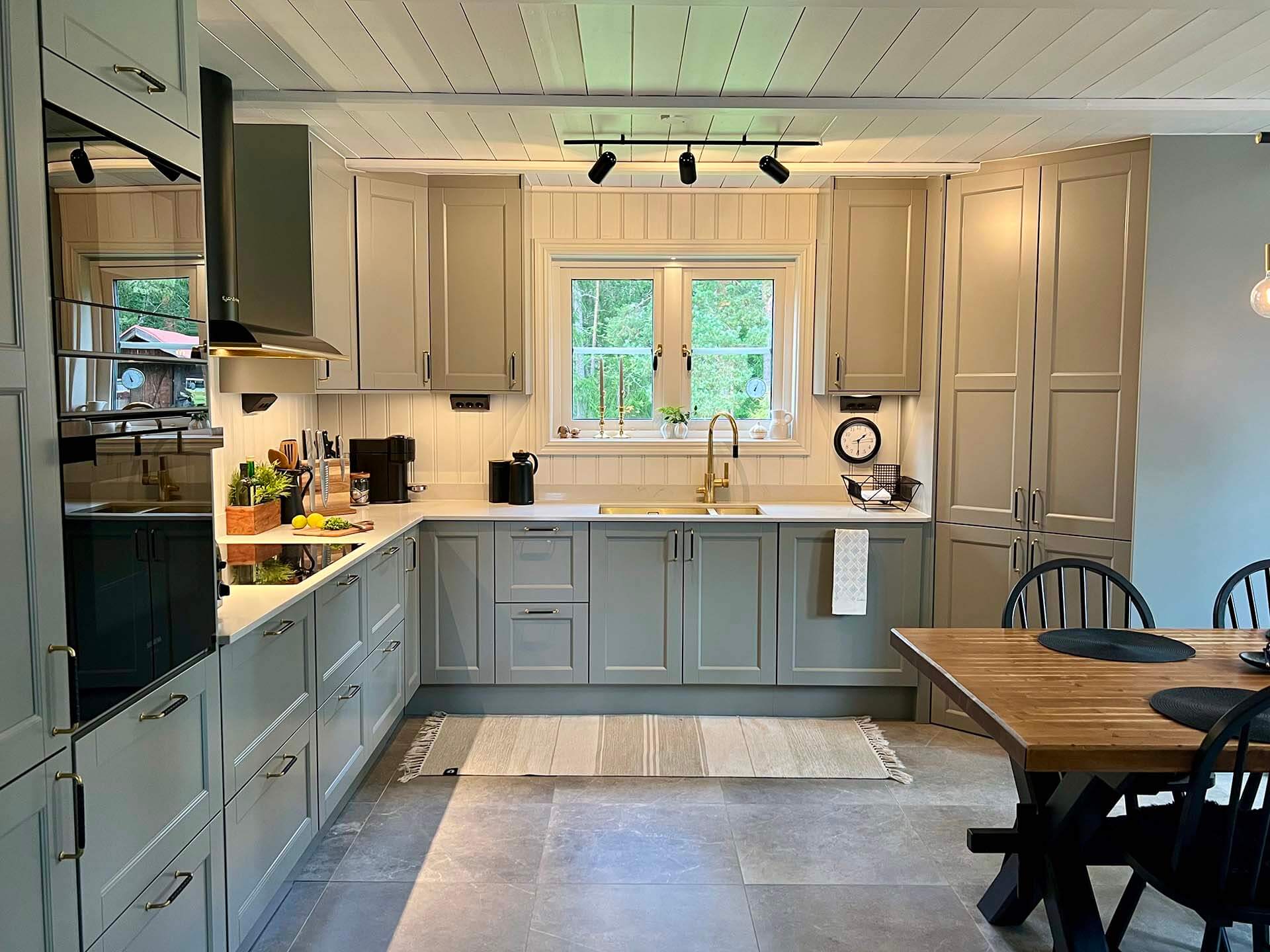 Vi bygger och monterar kök, platsbyggda eller standardkök, du väljer. Här har vi totalrenoverat ett kök med ny panel och klinkers samt nya ytskikt. Köket kommer från Marbodal medan bl.a. fläkt, bänkskiva, kran, diskho, beslag och handtag kommer från andra leverantörer, allt utifrån kundens önskemål.
