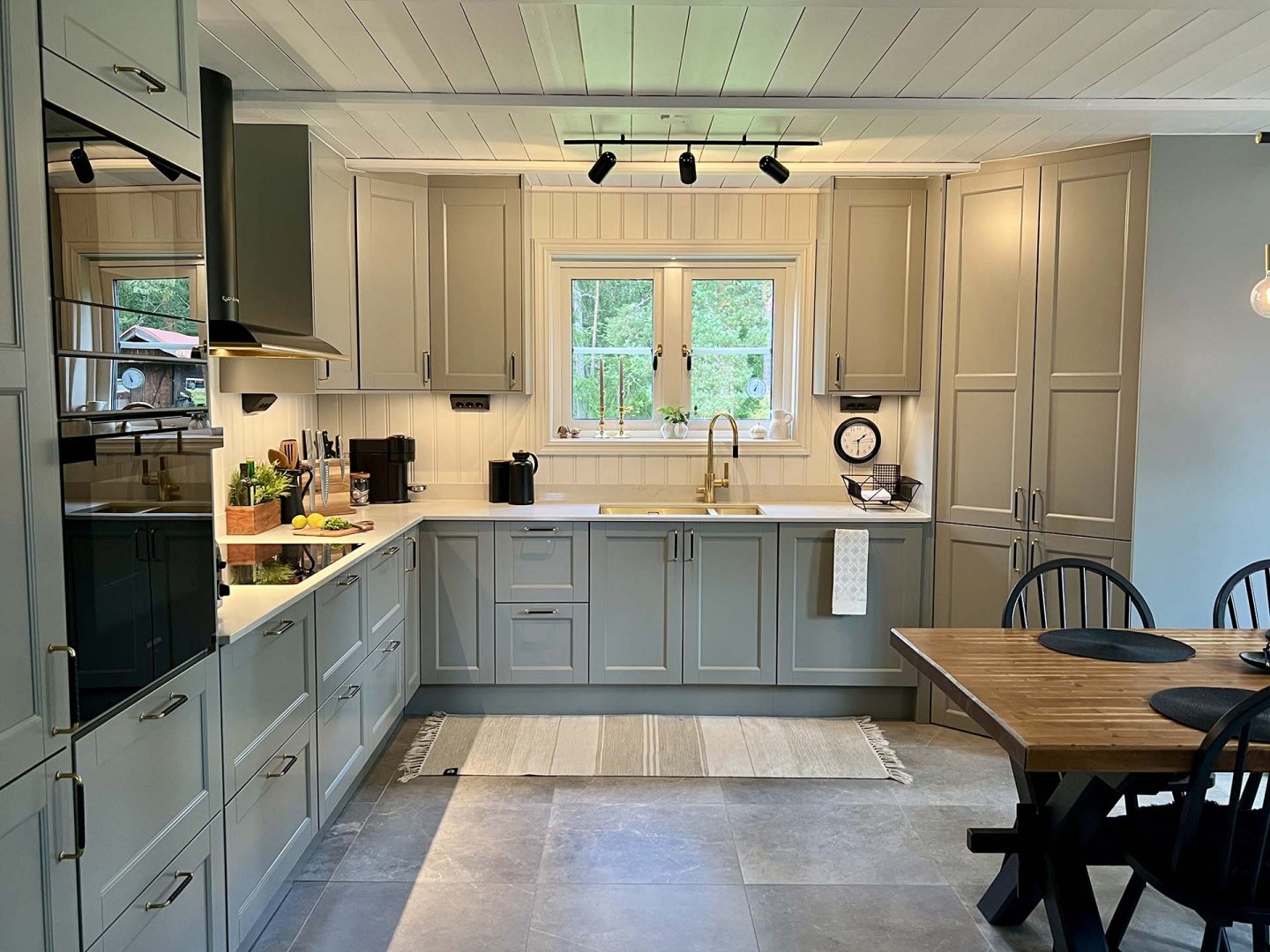 Vi bygger och monterar kök, platsbyggda eller standardkök, du väljer. Här har vi totalrenoverat ett kök med ny panel och klinkers samt nya ytskikt. Köket kommer från Marbodal medan bl.a. fläkt, bänkskiva, kran, diskho, beslag och handtag kommer från andra leverantörer, allt utifrån kundens önskemål.